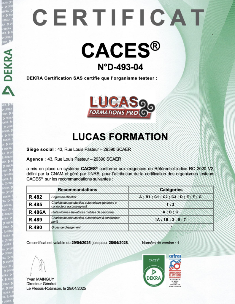 LUCAS FORMATION, est certifié Organisme Testeur CACES® pour délivrer les Certificats d’Aptitude à la Conduite En Sécurité des engins de chantier, grues de chargement, nacelles élévatrices, chariots de manutention à conducteur porté et gerbeurs accompagnants.